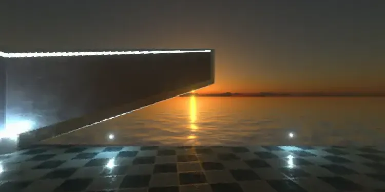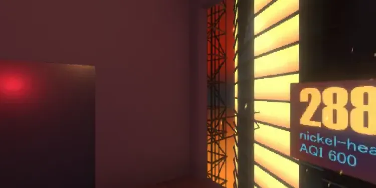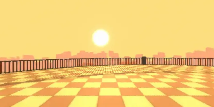 A simple balcony on Thunder Science Comapny's tall, cylindrical building. You can see the sun hovering over the horizon of the ruins of a long-gone city. This is about the hit indie game Changed by DragonSnow.
